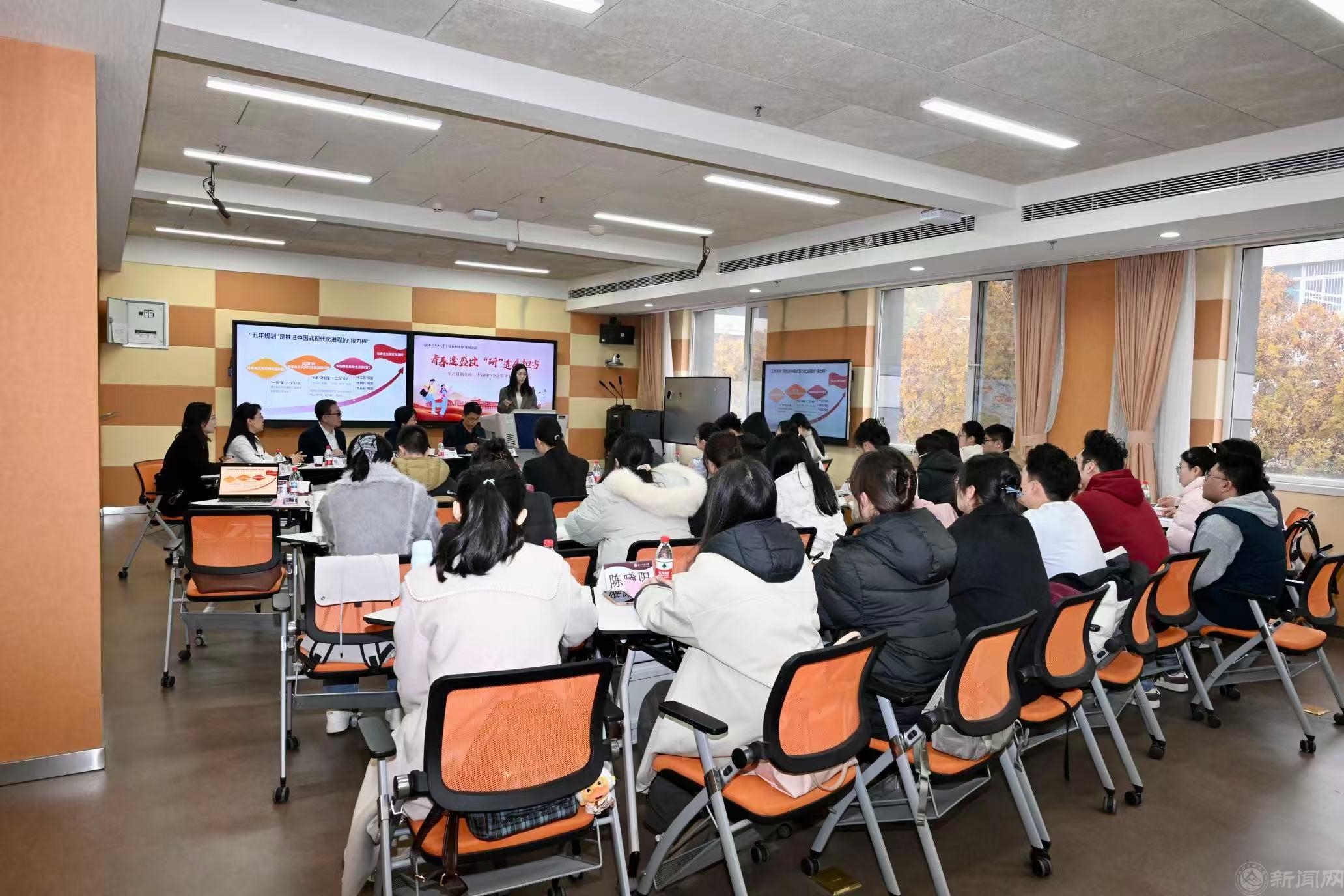 团日活动的“理论领航”环节,马克思主义学院思政课教师郑娜娜做党的二十届四中全会精神学习主题分享,引导同学们深刻把握全会核心要义,从“五年规划”中读懂中国之治的“密钥”,引发同学们从“知”到“行”的思考。