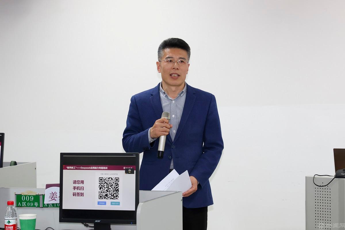为贯彻《教育强国建设规划纲要(2024—2035年)》,提升教师数字素养,深化人工智能助推教师队伍建设,4月18日,党委教师工作部、校工会、人事处联合教务处、网信中心、信息学院和保密办公室,在博远楼第一机房举办教师数字素养提升工程首期DeepSeek应用能力专题培训。校党委副书记姜孔桥出席并作培训动员讲话,全校近150名教师参加培训。