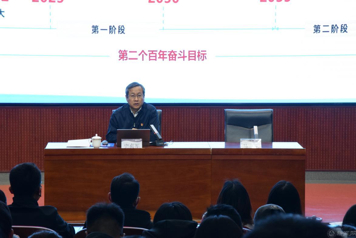 史贞军以《学习贯彻党的二十届四中全会精神,争做优秀学生党员》为题,紧密围绕学习贯彻习近平总书记在党的二十届四中全会上的重要讲话精神和全会通过的《中共中央关于制定国民经济和社会发展第十五个五年规划的建议》,系统梳理了《建议》的核心内容与框架脉络,带领师生共同回顾了“十四五”时期我国经济社会发展取得的辉煌历史性成就,并重点从12个方面讲解了“十五五”时期经济社会发展的战略任务与重大举措,对全会精神进行了深入浅出的阐释和宣讲。