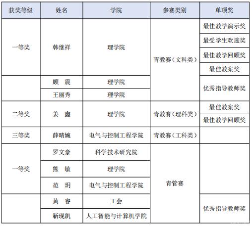 青教赛一等奖获奖教师:理学院韩继祥(文科类B组第一名)、青教赛二等奖获奖教师:理学院姜鑫、青教赛三等奖获奖教师:电气与控制工程学院薛晴婉