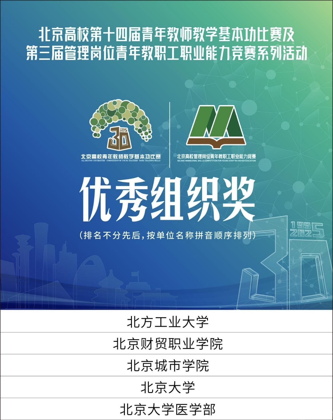 近日,北京高校第十四届青年教师教学基本功比赛(以下简称“青教赛”)及第三届管理岗位青年教职工职业能力竞赛(以下简称“青管赛”)综合成绩正式揭晓,学校荣获优秀组织奖,beat365选手获得一等奖2项、二等奖1项、三等奖1项,单项奖8项。获奖名单如下: