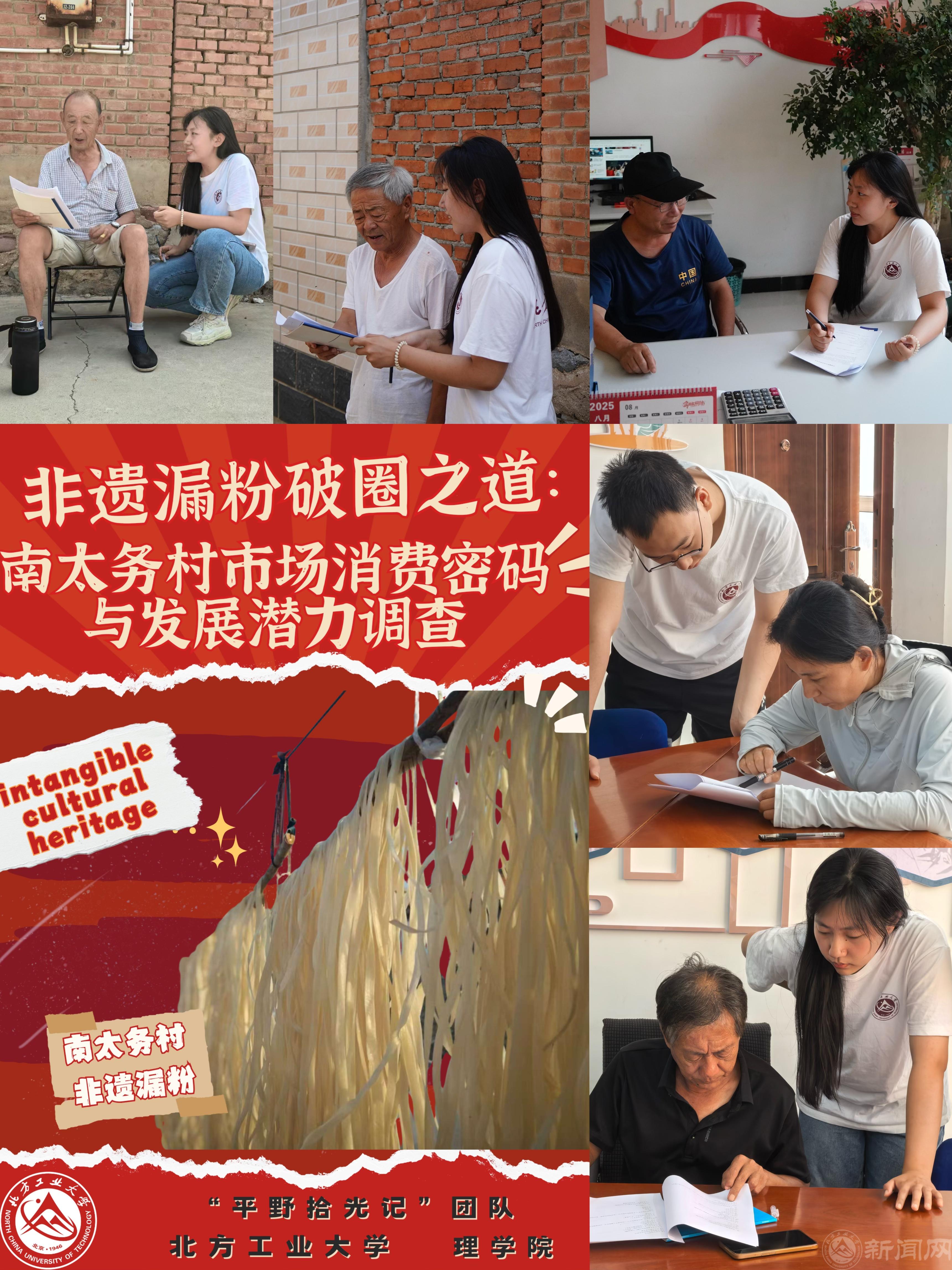 在深度体验基础上,团队依托专业知识,通过514份问卷与深度访谈完成《非遗漏粉破圈之道:南太务村市场消费密码与发展潜力调查》市场调查报告研究,创新提出“文化赋能-技术升级-产业链整合”三位一体活化路径,精准设计“非遗工坊+传承人+农户”协作模式,旨在优化产业链、强化品牌、保护生态,构建“技艺存续—产品升级—文化传播”发展闭环。 团队以田间实践筑牢认知,以学术智慧激活传统,为非遗漏粉的活态传承与可持续发展贡献“北方工大方案”,助力其焕发新生。