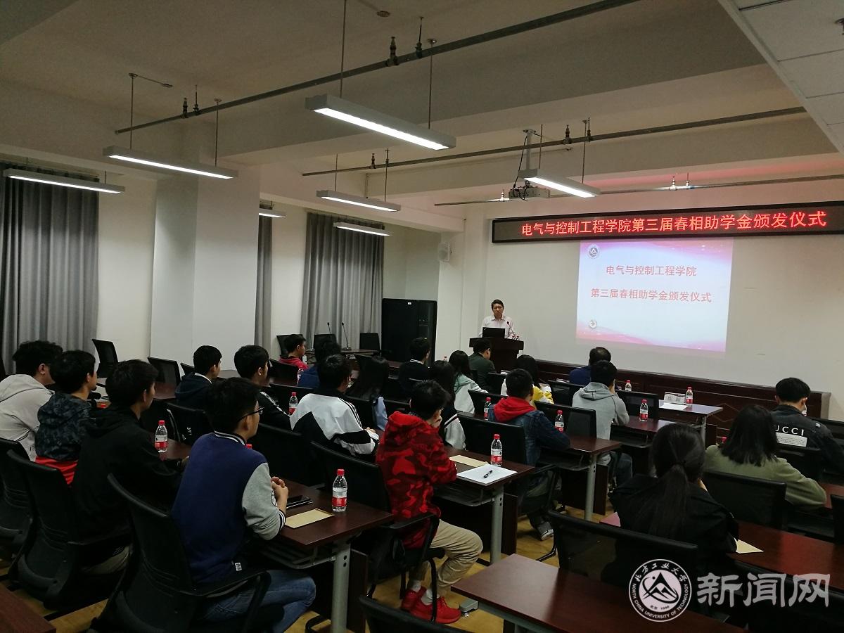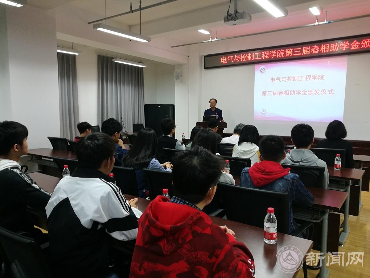 4月24日,电气与控制工程学院在博远楼452举行第三届春相助学金颁发仪式。学院院长王力、特别代表武家申、辅导员库颖及获助的20名学生参加仪式。仪式由院党委副书记史宁主持。