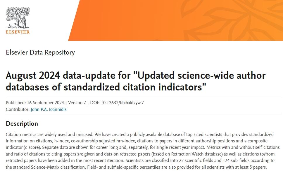 该榜单是斯坦福大学John P. A. Ioannidis教授团队与Elsevier与合作的项目成果,发布在Elsevier旗下的Mendeley Data网站上。榜单基于Scopus数据库的引用数据系统分析,以被引数(区分自引和他引,提供自引数据)、H指数、HM因子等6种综合指标 (composite score,C-score),根据 “生涯影响力”和“年度影响力”从近700万名科学家中遴选出世界排名前2%的科学家,分为22个领域和176个细分子领域。榜单提供了面向科学家长期科研表现的衡量指标,客观真实反映科学家的学术影响力。