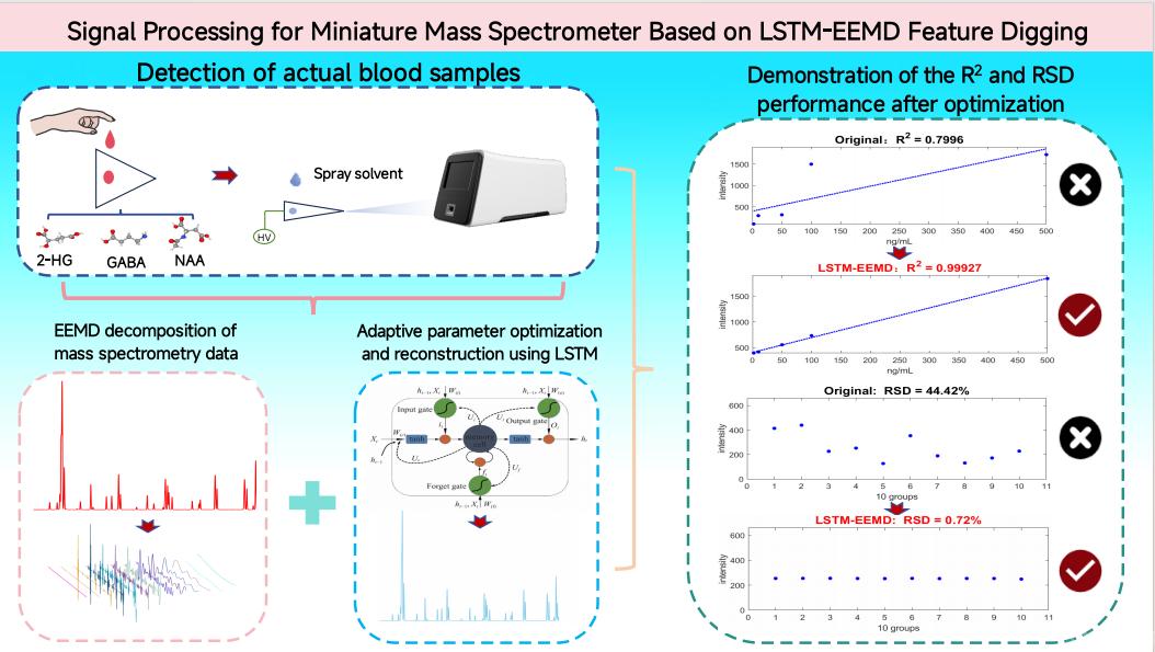 近期,beat365电控学院李明研究员在国际顶级期刊《Talanta》(中科院一区、TOP期刊)发表题为“Signal Processing for Miniature Mass Spectrometer Based on LSTM-EEMD Feature Digging”的研究论文。该研究创造性地提出了一种基于长短期记忆-集合经验模态分解(LSTM-EEMD)的数据处理方法,为提高小型质谱仪在复杂基质样品和恶劣环境条件下的现场检测性能开辟了新路径。